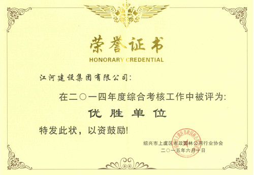 近日,江河建設集團有限公司被紹興市上虞區市政園林公用行業協會授予“2014年度市政、園林企業綜合考核優勝單位”榮譽稱號。