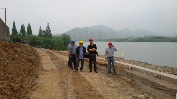 2015年4月29日一早,省水利水電工程質量與安全監督中心黃黎明主任等領導與專家在錢塘江管理局寧紹管理處主任鄔越民、上虞區水利水電工程質量監督站站長吳信達等陪同下,前來本司承建的曹娥江省管海塘曹娥石塘段加固工程(“強塘”工程)檢查指導工作,黃黎明主任一行全線檢查了工程的施工質量和進度情況。在u型防沖板樁施工現場,黃黎明主任在聽取工程介紹和施工安全、質量控制情況匯報后,充分肯定了工程的施工質量和安全生產控制措施,要求各參建單位時刻抓緊工程質量和安全生產不放松,措施上再完善,行動上再落實,并確保工程安全渡汛。