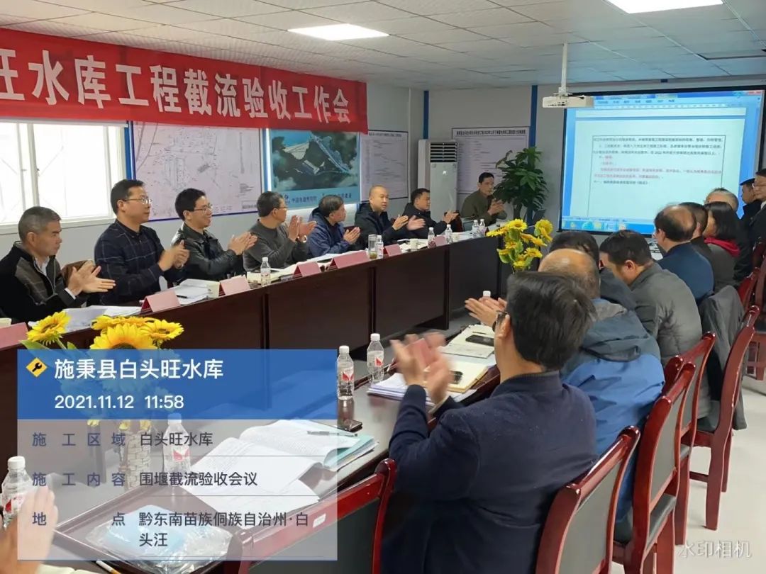 驗收會議由黔東南州水務局主持召開。州水務局、州發展和改革委員會、州生態移民局、施秉縣人民政府、縣發展和改革局、縣水務局、縣生態移民局、城關鎮人民政府、州水利水電工程質量與安全中心、州水投及參建各方組成的白頭旺水庫工程截流驗收工作組,對白頭旺水庫工程截流進行驗收。驗收工作組通過現場檢查,查閱有關資料,聽取PMC、設計、施工、監理、質量監督等單位對工程截流相關工作的匯報和評價后,一致同意截流驗收通過。