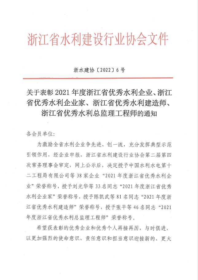 近日,浙江省水利建設行業協會公布了浙水建協(2022)6號文件,對我省一批水利企業、水利企業家、水利建造師、水利總監理工程師進行了表彰通報。其中浙江江河建設有限公司榮獲“2021年度浙江省優秀水利企業”,公司董事長袁偉忠獲“2021年度浙江省優秀水利企業家”稱號。