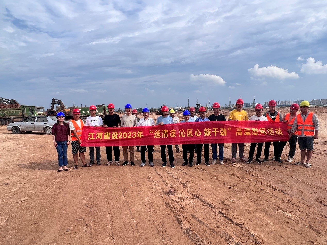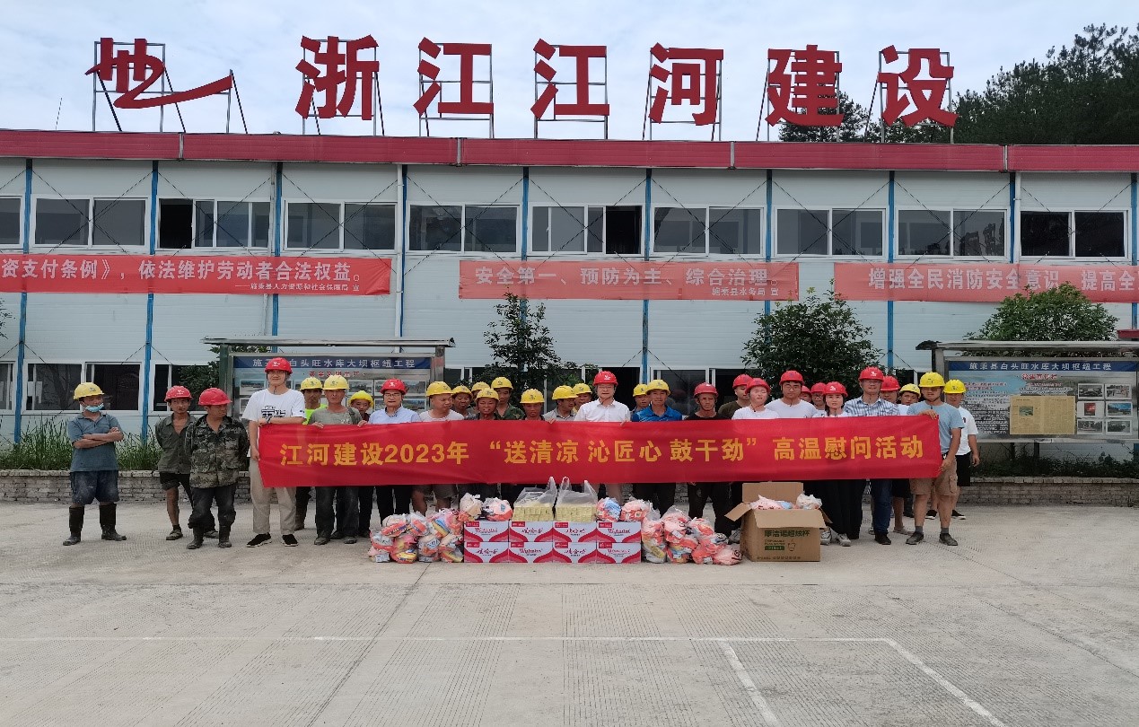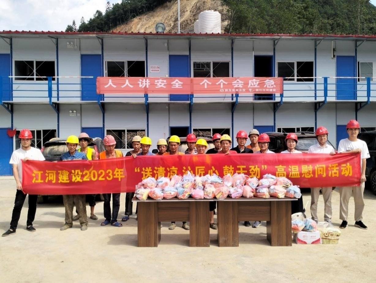 “夏送清涼,關懷暖心”。時值盛夏酷暑,江河建設公司各重點在建工程項目正在有序推進,一線的職工們備受“烤”驗。為有效改善職工生產生活條件,認真做好高溫天氣職工勞動保護工作,連日來,浙江江河建設有限公司工會組織開展“送清涼,沁匠心,鼓干勁”為主題的高溫慰問活動,成立由工管、工會、人力、安全等負責人組成的“紅+安全”慰問組,帶著公司董事長袁偉忠、總裁陳宋江的關懷問候和委托,深入全國各地的項目施工現場,慰問奮戰在高溫一線的工人,為其送去礦泉水、毛巾、風油精、飲料、藿香正氣水等防暑降溫等物資,并為他們對公司高質量發展建設作出的貢獻表示感謝。
